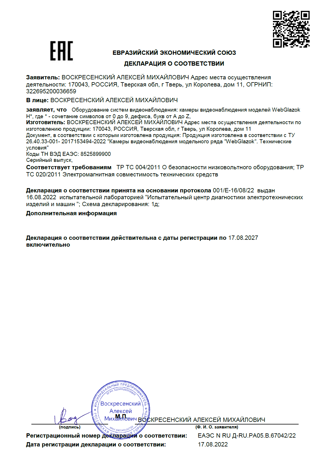 Камера использует платный облачный сервис WebGlazok для хранения видео и возможности удаленного просмотра. Тарифы на облачный сервис.